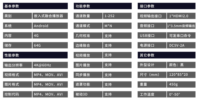 支持1024*768 1280*720 1280*800 1920*1080 1920*1200 3840*2160以及90°旋轉(zhuǎn)輸出,支持投影機(jī)橫向縱向拼接融合。