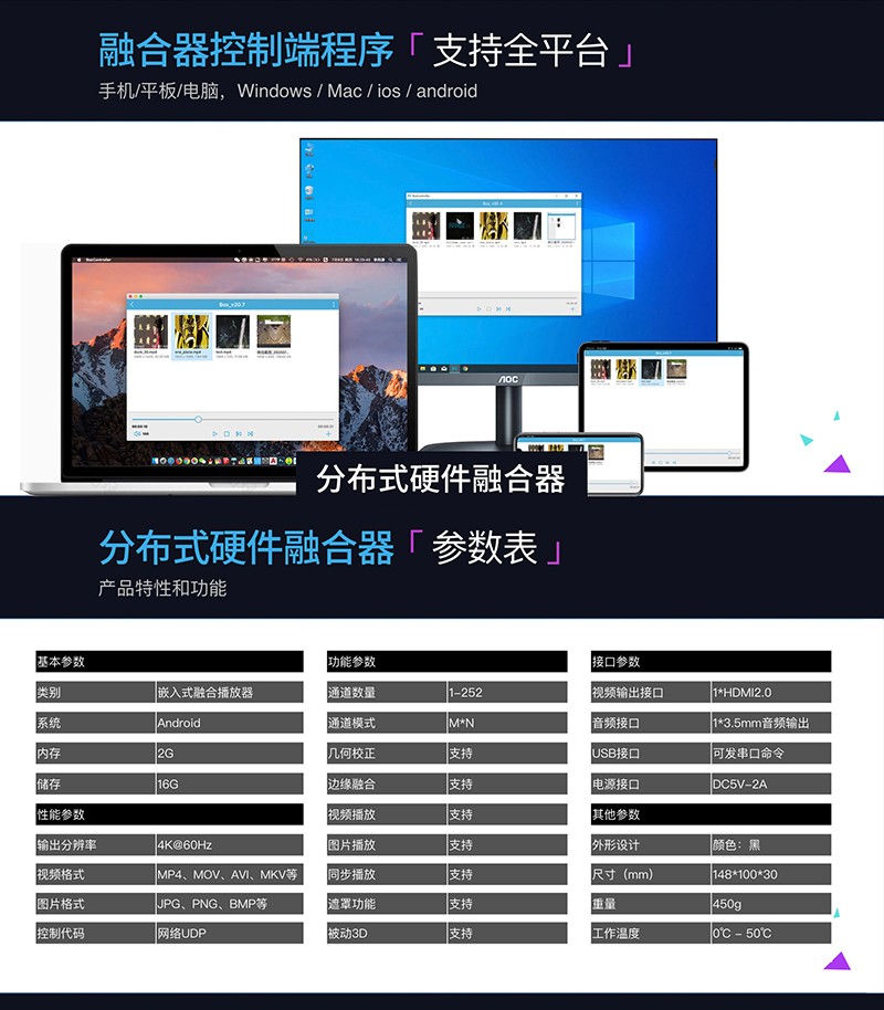 可作為各行業(yè)顯示設(shè)備,如投影機(jī)、投影燈、液晶電視、LED等多種輸出設(shè)備的播放信號源。