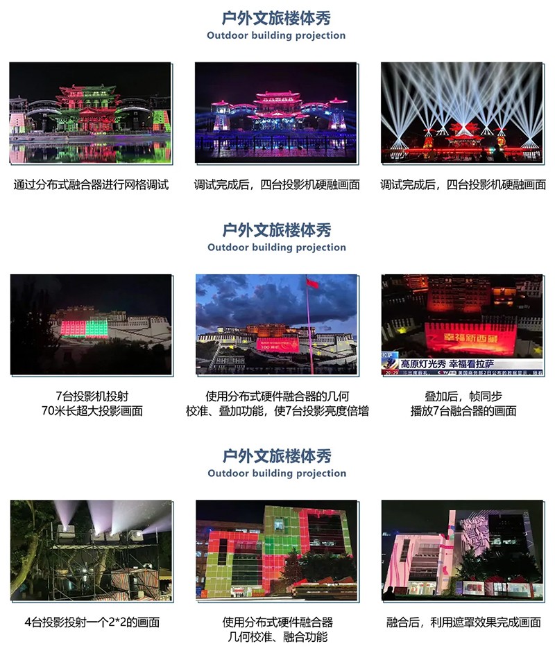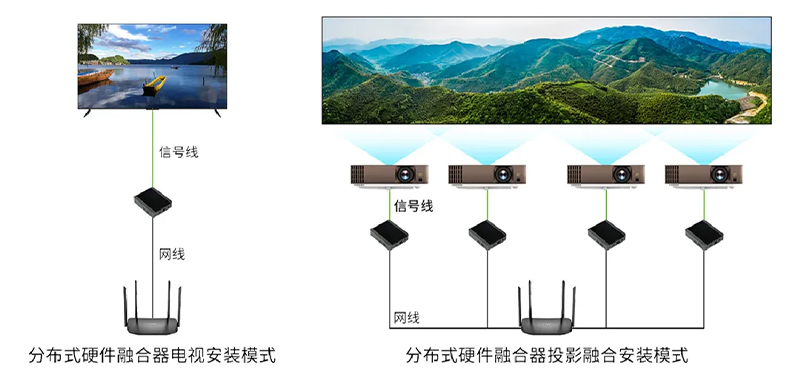 分布式硬件融合器直接輸出HDMI信號至投影機(?臺融合器對應(yīng)?臺投影機),融合器之間用路由器組成局域網(wǎng),融合器ip自動獲取。
