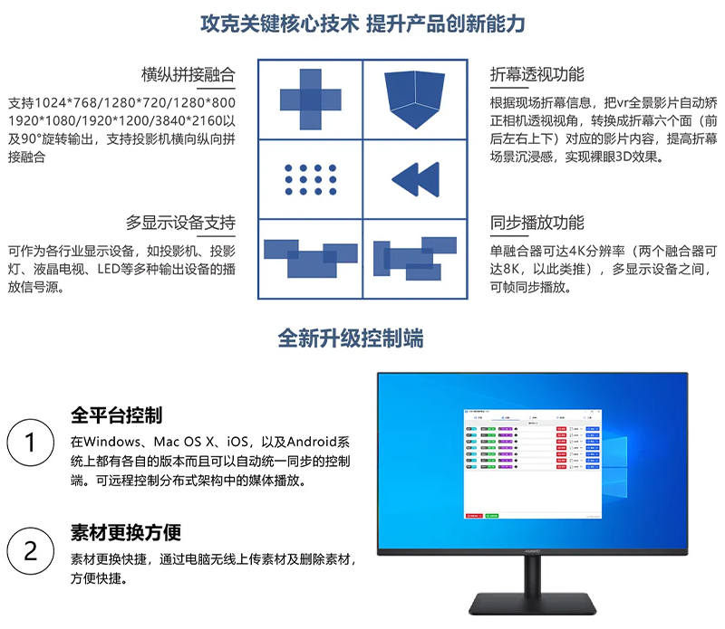 廣泛應(yīng)用于展覽展示行業(yè)的顯示輸出設(shè)備,代替?zhèn)鹘y(tǒng)電腦,采用分布式硬件融合器輸出圖像部署更加簡單,信號傳輸更加穩(wěn)定。