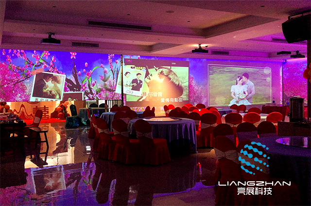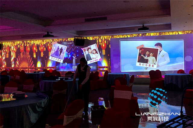 全息宴會廳是將全息投影、T臺互動、舞美道具、婚紗投影、燈光、音響、聲光電等科技元素整合到宴會廳中, 在相互配合的基礎(chǔ)上,通過觸控選擇模式,呈現(xiàn)出沉浸式效果視覺盛宴,原始森林、海底世界、浪漫花海、實現(xiàn)各個場景的瞬間切換置身其中,改變了傳統(tǒng)宴會廳道具固定的形式。