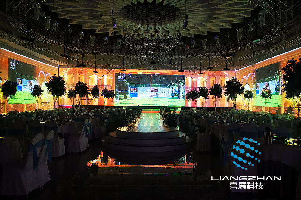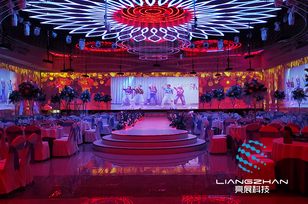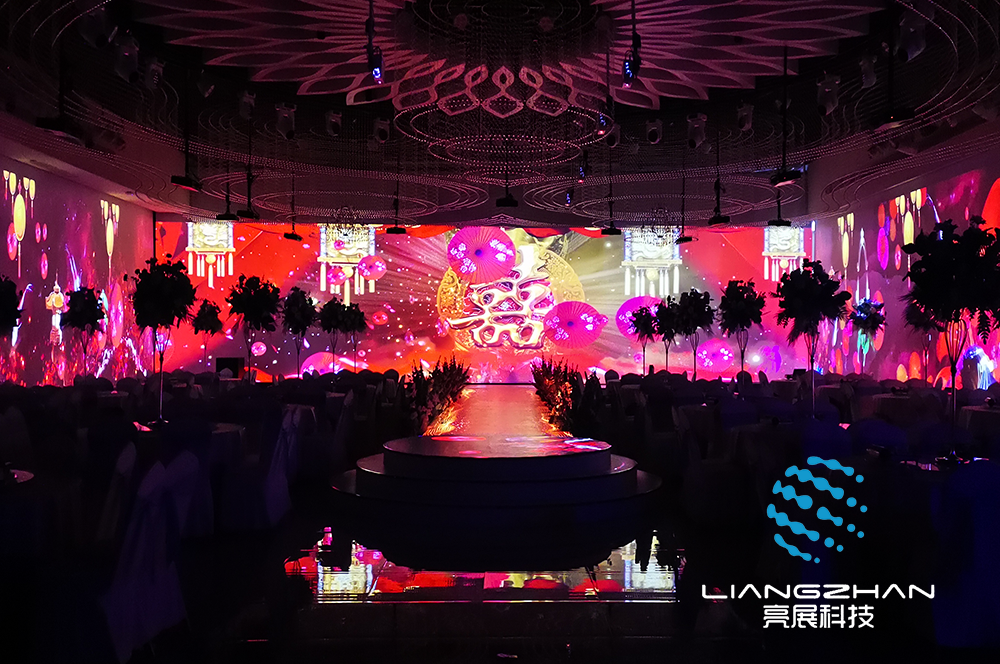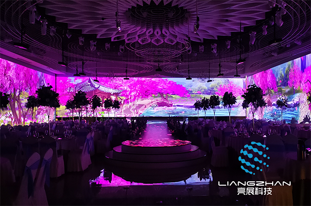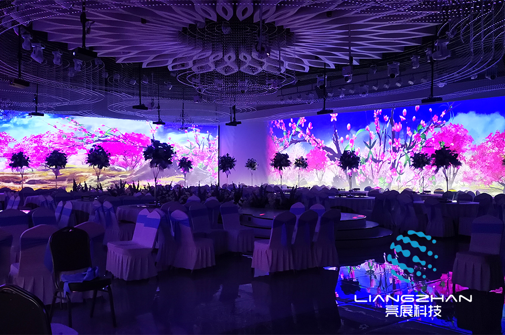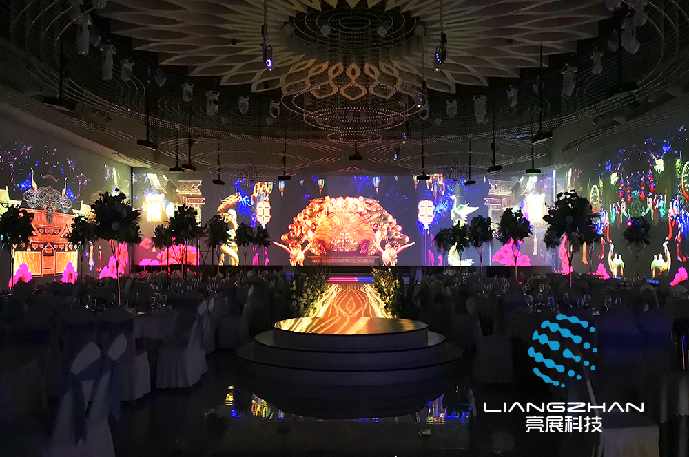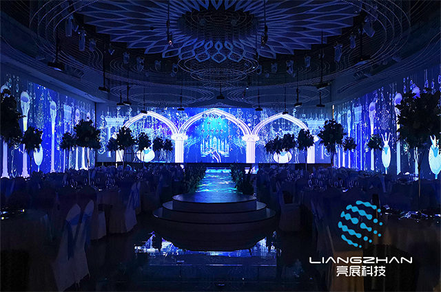 全息宴會(huì)廳是將全息投影、T臺(tái)互動(dòng)、舞美道具、婚紗投影、燈光、音響、聲光電等科技元素整合到宴會(huì)廳中, 在相互配合的基礎(chǔ)上,通過(guò)觸控選擇模式,呈現(xiàn)出沉浸式效果視覺(jué)盛宴,原始森林、海底世界、浪漫花海、實(shí)現(xiàn)各個(gè)場(chǎng)景的瞬間切換置身其中,改變了傳統(tǒng)宴會(huì)廳道具固定的形式。