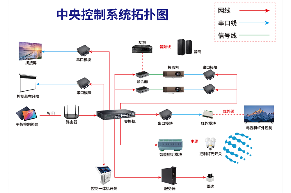 中央控制系統(tǒng)界面設計風格簡潔,控制按鈕模塊化設計,自由拖拽布局,同步適應Ios、Android設備,鼠標拖動,即可完成中控設計制作,保存同步即見效果。通過有線/無線網(wǎng)絡智能集成化設計,該系統(tǒng)是建立在無線局域網(wǎng)的新一代技術(shù)平臺,性能穩(wěn)定,不受物理距離限制,方便客戶在移動過程中也能對展廳中各個展項的控制和展示。根據(jù)客戶實際展項設備情況,控制各類聲、光、電、視,即可實現(xiàn)各個展廳展區(qū)集中控制,分區(qū)控制、分項控制、級聯(lián)控制、視頻燈光聯(lián)動控制等方式。