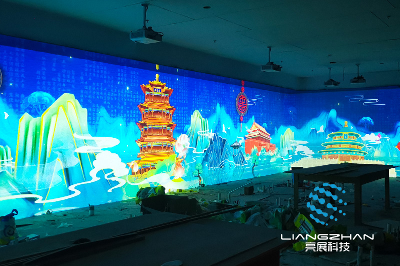 本次項(xiàng)目位于湖南某會(huì)所,利用7臺(tái)投影機(jī)和分布式融合器打造一個(gè)顯示尺寸更大、畫面分辨率更高且視覺效果更為震撼的巨幅畫面!