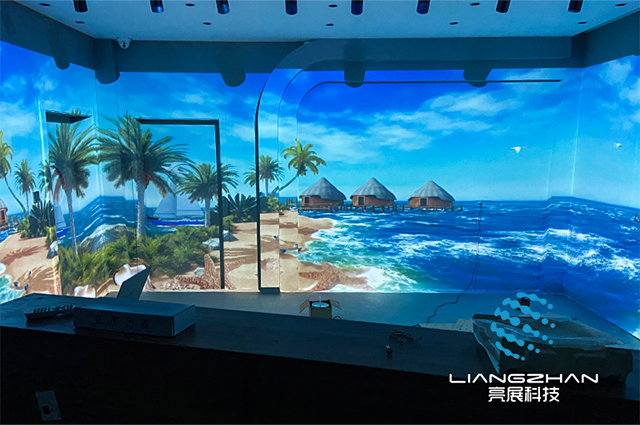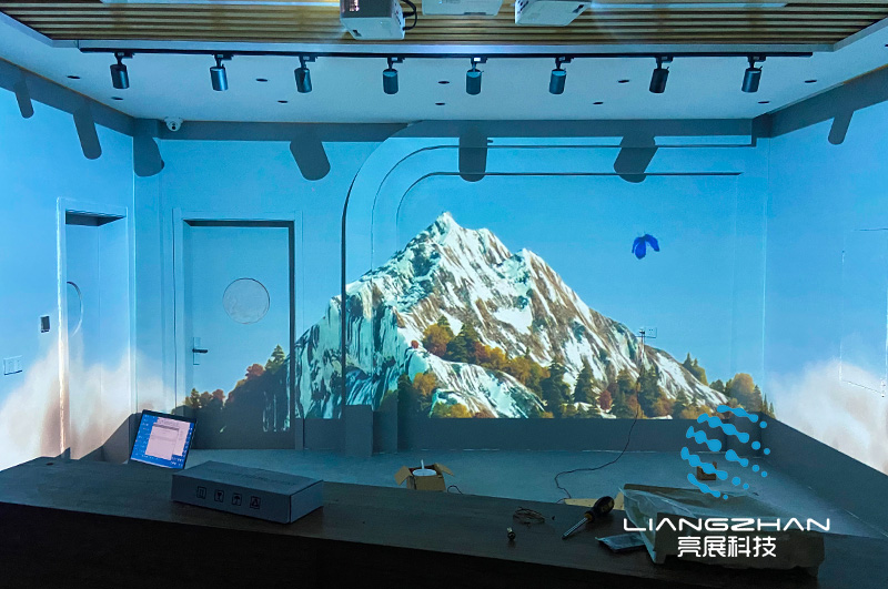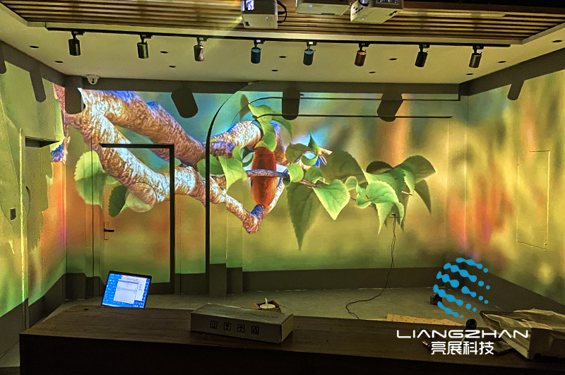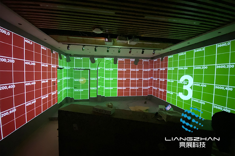本次項(xiàng)目位于徐州,利用多通道投影融合技術(shù)打造全息光影空間;3臺(tái)投影機(jī)投出的圖像經(jīng)過(guò)分布式硬件融合器的處理,從而實(shí)現(xiàn)一整幅完整無(wú)縫的畫(huà)面。