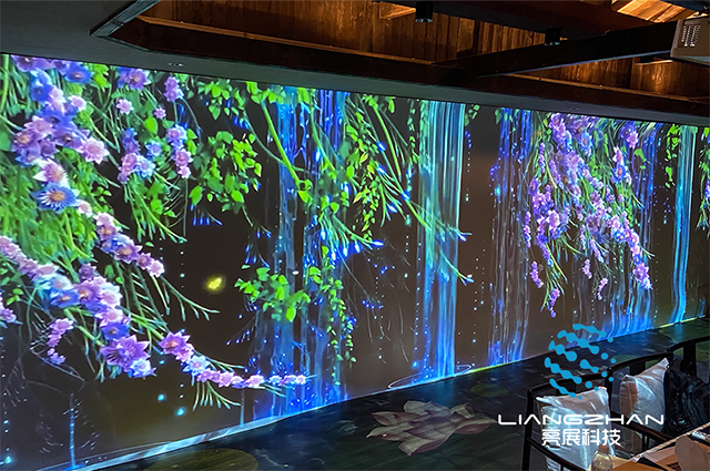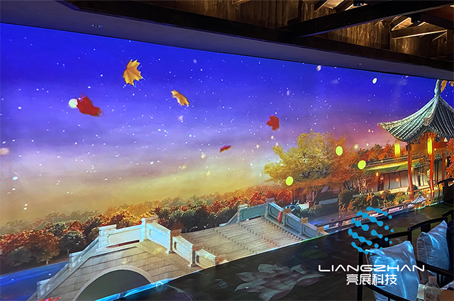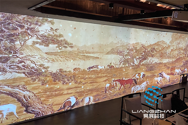 當傳統(tǒng)遇上了科技,茶舍一改往日‘靜態(tài)’的形象,以動態(tài)之美呈現(xiàn)在愛茶之人眼前,墻面上虛實結合的動畫,畫中動態(tài)的美感,夏日的蟬鳴,微風浮動樹葉輕顫,花瓣徐徐飄落……