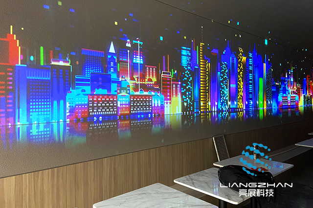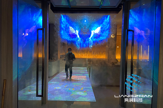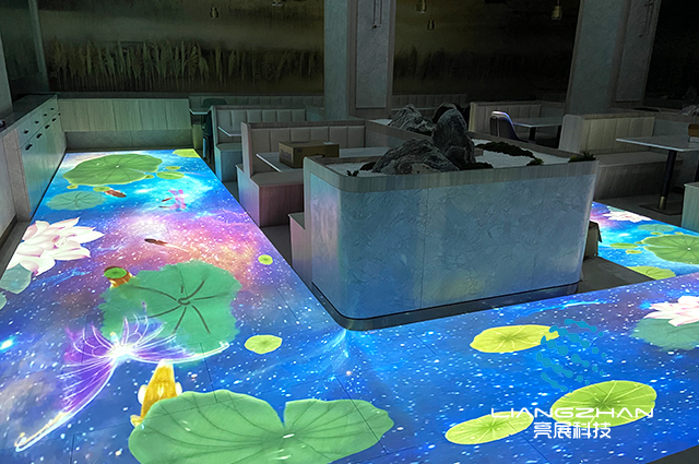 餐廳內(nèi)配備上地面互動(dòng)投影,系統(tǒng)采用先進(jìn)的計(jì)算機(jī)視覺(jué)技術(shù)和投影顯示技術(shù)來(lái)營(yíng)造一種奇幻動(dòng)感的交互體驗(yàn)。