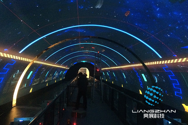 天幕投影是一種比較新穎的異形投影技術(shù),其系統(tǒng)形成的原理主要是利用多臺(tái)投影機(jī)投射畫面,然后通過投影融合技術(shù)將畫面無縫拼接,最后將投影幕放置在整個(gè)室內(nèi)的穹頂,配以音響系統(tǒng)、燈光系統(tǒng),從而形成一種氣勢(shì)恢宏的震撼畫面,伴隨著立體環(huán)繞音讓身處其中的人們仿佛身臨其境。