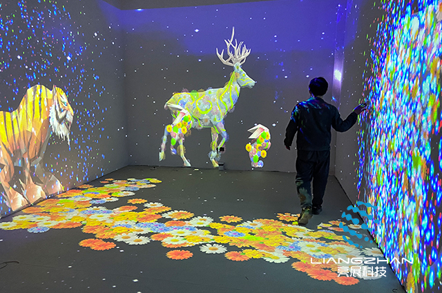 地面互動(dòng)投影采用懸掛在頂部的投影設(shè)備把影像效果投射到地面,當(dāng)參訪著走至投影區(qū)域時(shí),通過(guò)系統(tǒng)識(shí)別,參訪者可以直接使用雙腳或動(dòng)作與投影幕上的虛擬場(chǎng)景進(jìn)行交互,互動(dòng)效果就會(huì)隨著你的腳步產(chǎn)生相應(yīng)的變幻。