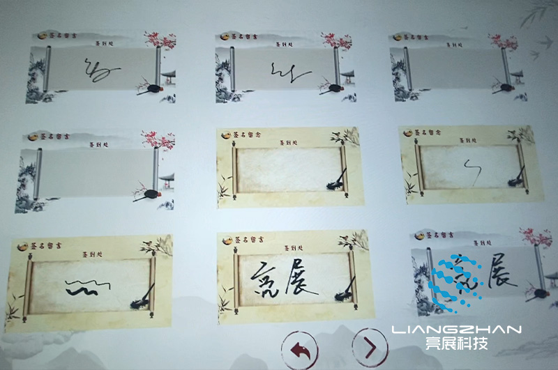 簽名留言系統(tǒng)的功能就是簽名留言留念,參展者可以在互動裝置上留下自己的簽名,同時其中還能夠選擇相應(yīng)的書法筆刷,這種方式避免了手寫字體不規(guī)范、留言紙不夠用等問題,而且比之傳統(tǒng)的手寫留言更加高效、易讀,能促進參會者之間的交流和分享。