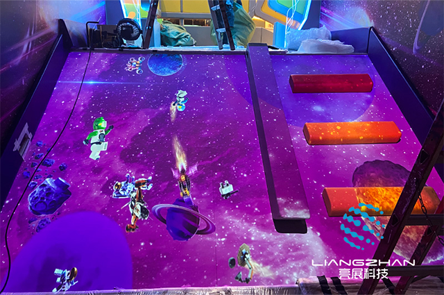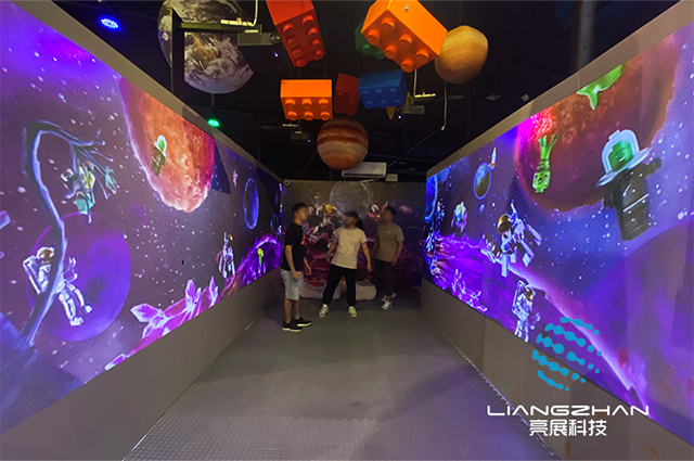 本次項目運用多通道投影融合技術(shù)、互動系統(tǒng)相互配合打造兒童樂園互動投影效果。