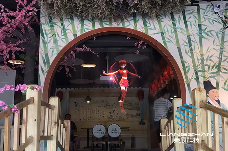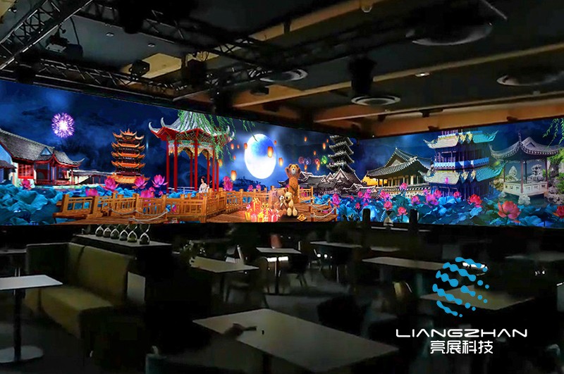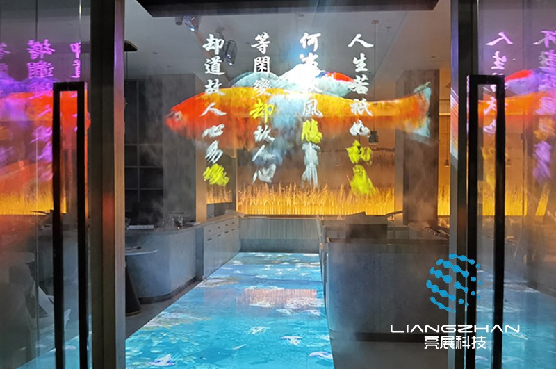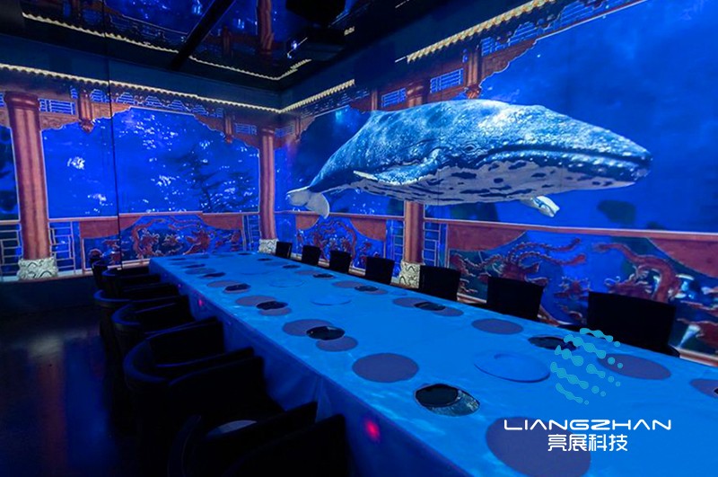 大廳墻面投影結(jié)合3D全息投影技術(shù)和3D數(shù)字動畫,以餐廳墻面、幕布用作投影載體,構(gòu)建動態(tài)環(huán)境場景,使餐廳產(chǎn)生空間動感的3D立體效果。