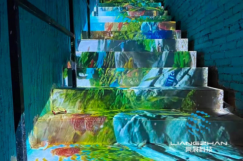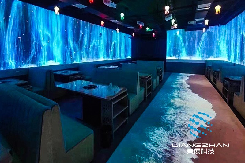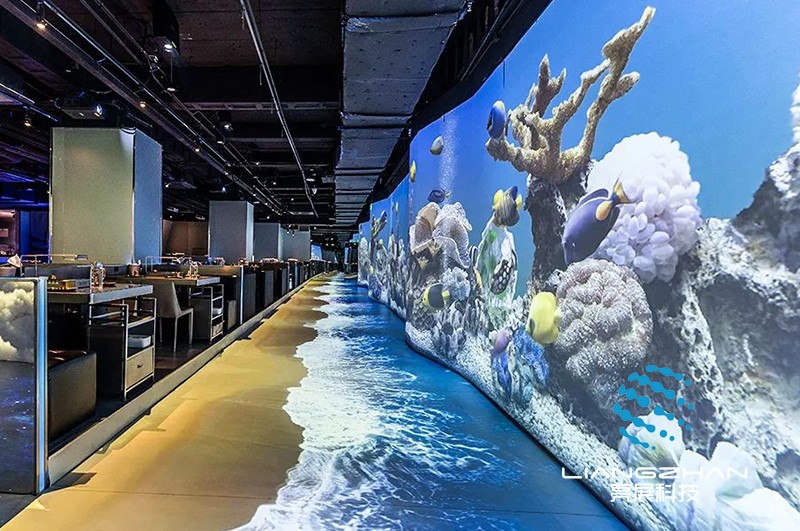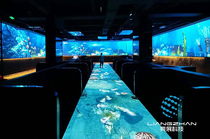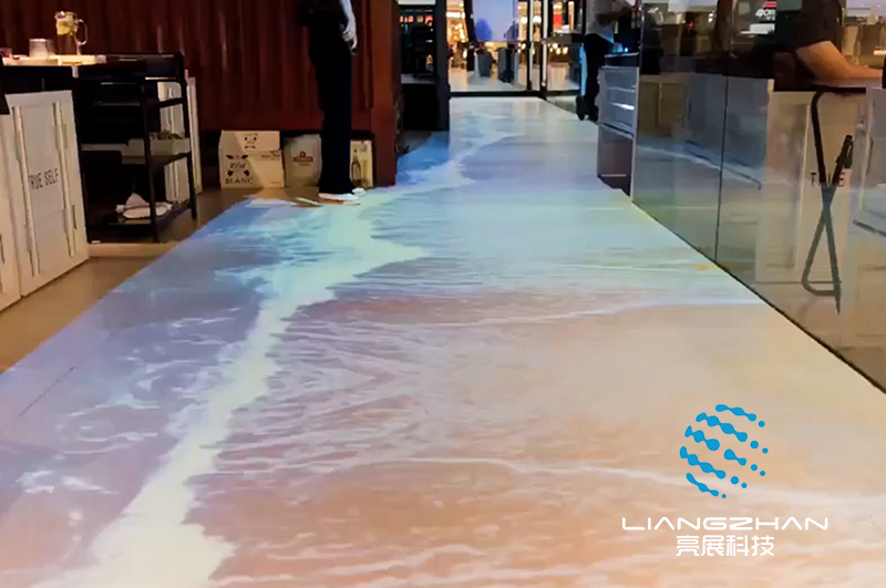 地面互動投影常用于走廊過道等公共區(qū)域,可以投放沙灘、海底世界等各種主題,通過不同的內(nèi)容定制,讓顧客有不一樣的用餐體驗。