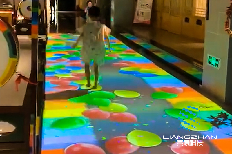 地面互動投影可增加餐廳趣味性,懸掛在頂部的投影設(shè)備把影像效果投射到地面,當(dāng)顧客至投影區(qū)域時,可以直接使用雙腳或動作與投影幕上的虛擬場景進行交互,互動效果就會隨著你的腳步產(chǎn)生相應(yīng)的變幻。