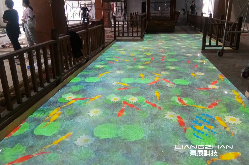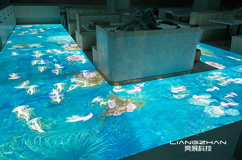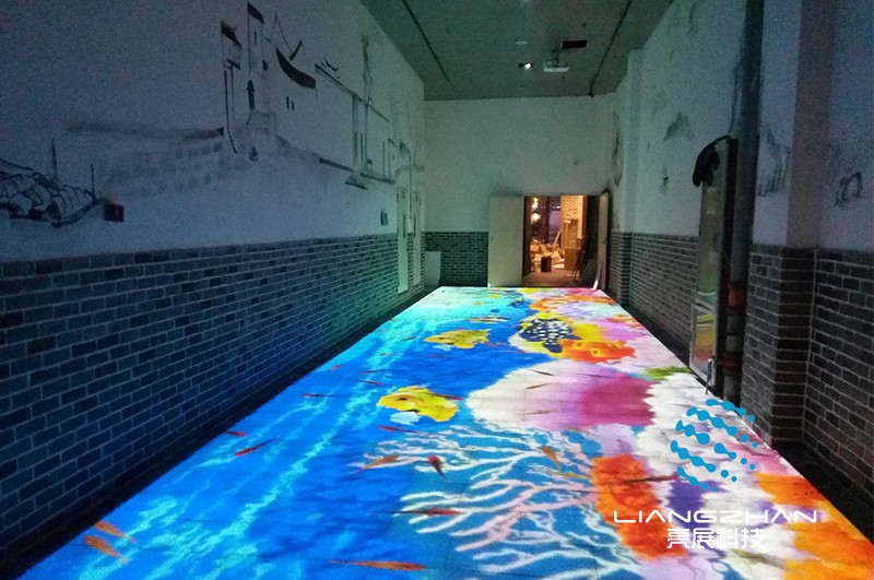 室內地面互動投影,一般用于各類展廳、展館、餐廳、酒吧等地。地面互動投影系統(tǒng)通過懸掛在頂部的投影機把影像內容投射到地面,當觀眾進入互動投影區(qū)域時,通過互動軟件系統(tǒng)識別,觀眾可以直接使用雙腳或其他動作與地面上投影的虛擬場景進行交互。